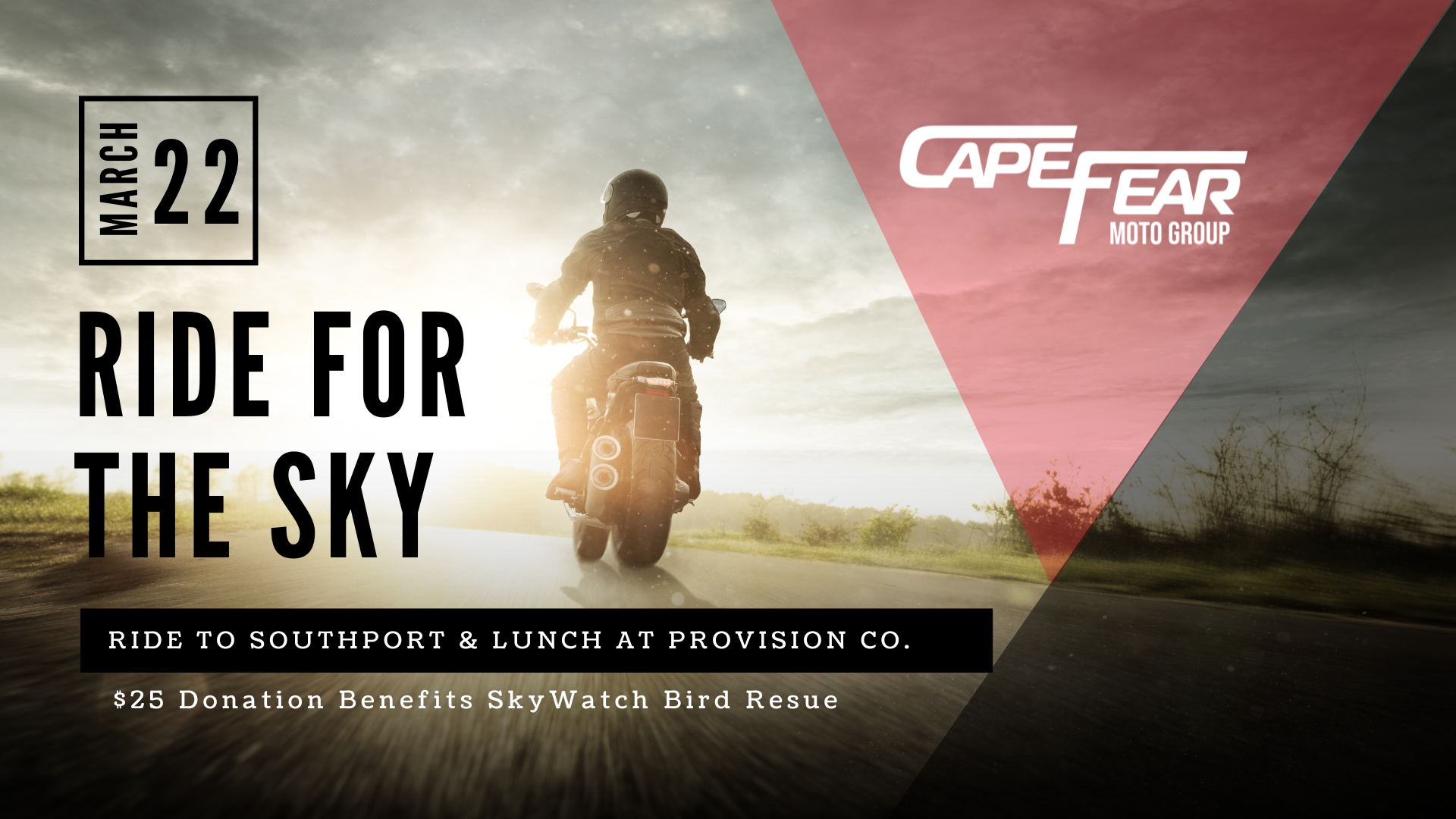 In an effort to support a local nonprofit near and dear to us, we’re requesting a donation of $25 for all riders that will go directly to SkyWatch Bird Rescue.