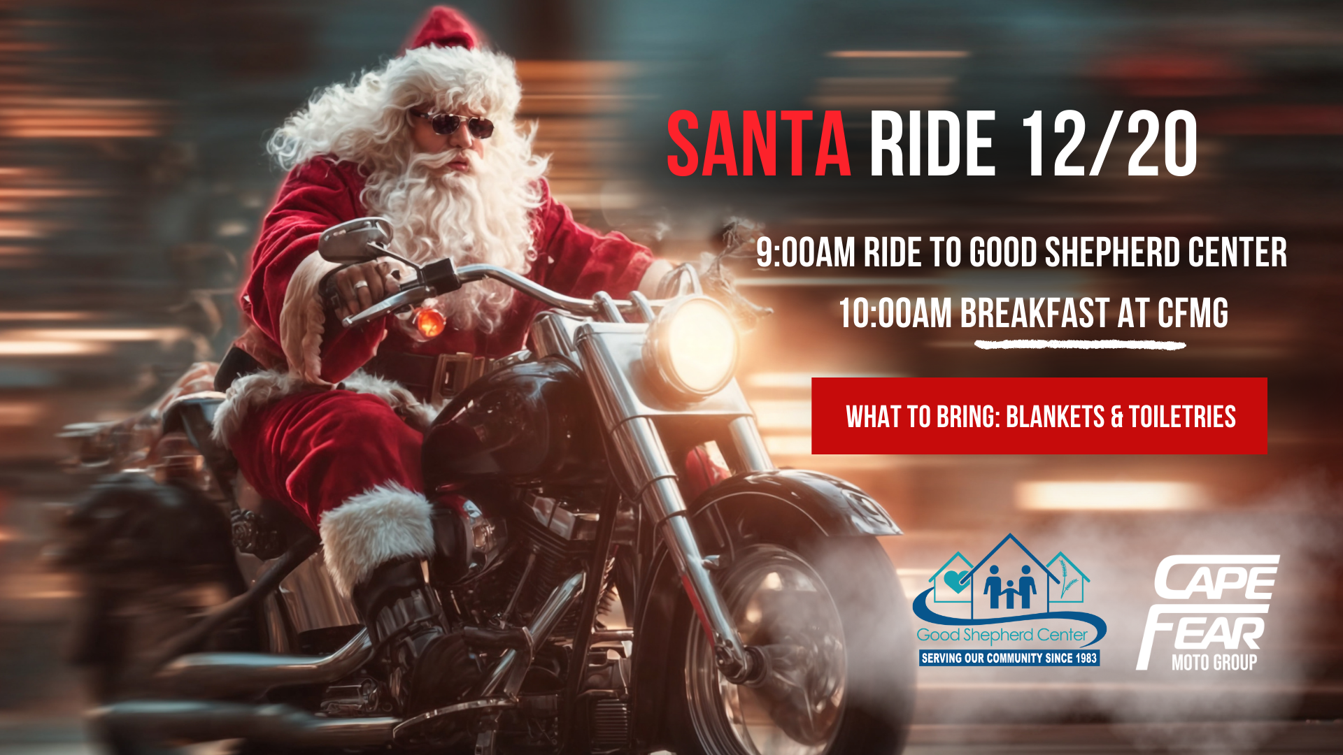 Riders! Meet us at Cape Fear Moto Group on Saturday, December 20th for a group ride down to the Good Shepherd Center with a few Santa sacks in tow 🎅🏽 Kickstands up at 9am!